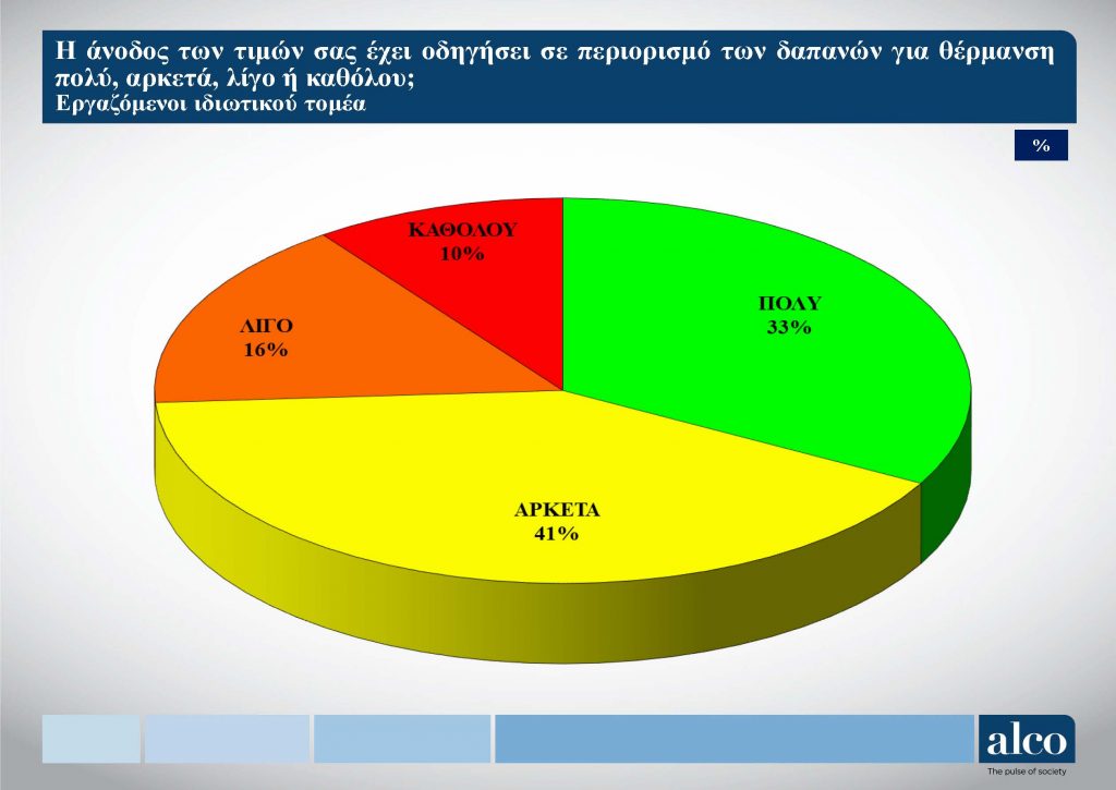  Το 74% των εργαζομένων, δηλώνει ότι η άνοδος των τιμών τους έχει οδηγήσει σε περιορισμό των δαπανών για θέρμανση. ¨Πολύ¨ απαντά το 33% και ¨Αρκετά¨ το 41%. Αντίστοιχα, το 16% στην αντίστοιχη ερώτηση δηλώνει ¨Λίγο¨ και το 10% ¨Καθόλου¨. (ΦΩΤΟ πιο κάτω)