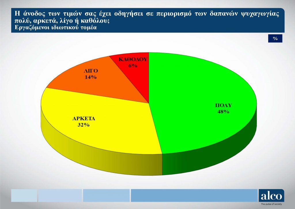  Το 80% των εργαζομένων, δηλώνει ότι η άνοδος των τιμών τους έχει οδηγήσει σε περιορισμό των δαπανών για ψυχαγωγία. ¨Πολύ¨ απαντά το 48% και ¨Αρκετά¨ το 32%. Αντίστοιχα, το 14% στην αντίστοιχη ερώτηση δηλώνει ¨Λίγο¨ και το 6% ¨Καθόλου¨. (ΦΩΤΟ πιο κάτω)