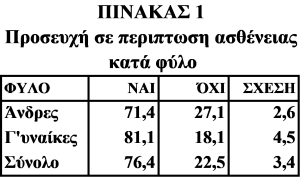 Από τον Πίνακα 1 φαίνεται ότι τόσο στο ποσοστό αυτών που απαντούν ΝΑΙ όσο και στη σχέση ΝΑΙ/ΟΧΙ την πρώτη θέση κατέχουν οι γυναίκες και τη δεύτερη οι άνδρες. Ενώ, όμως, διαφορά γυναικών/ανδρών στο ποσοστό που απαντούν ΝΑΙ είναι μικρή, η διαφορά της σχέσης ΝΑΙ/ΟΧΙ είναι πολύ μεγάλη.