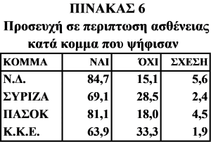 Από τον Πίνακα 6 φαίνεται ότι τόσο στο ποσοστό αυτών που απαντούν ΝΑΙ όσο και στη σχέση ΝΑΙ/ΟΧΙ την 1η θέση κατέχουν όσοι ψήφισαν Ν.Δ. και ακολουθούν εκείνοι που ψήφισαν ΠΑΟΚ, ΣΥΡΙΖΑ και Κ.Κ.Ε. Και στην περίπτωση αυτή το χαμηλότερο ποσοστό του ΝΑΙ (όσων ψήφισαν Κ.Κ.Ε), είναι πάνω από 60%.
