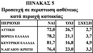 Από τον Πίνακα 5 φαίνεται ότι τόσο στο ποσοστό αυτών που απαντούν ΝΑΙ όσο και στη σχέση ΝΑΙ/ΟΧΙ την 1η θέση κατέχουν εκείνοι που κατοικούν στην Κεντρική Ελλάδα και ακολουθούν όσοι κατοικούν στη Βόρεια Ελλάδα, στα Νησιά Αιγαίου-Κρήτη και Αττική.
