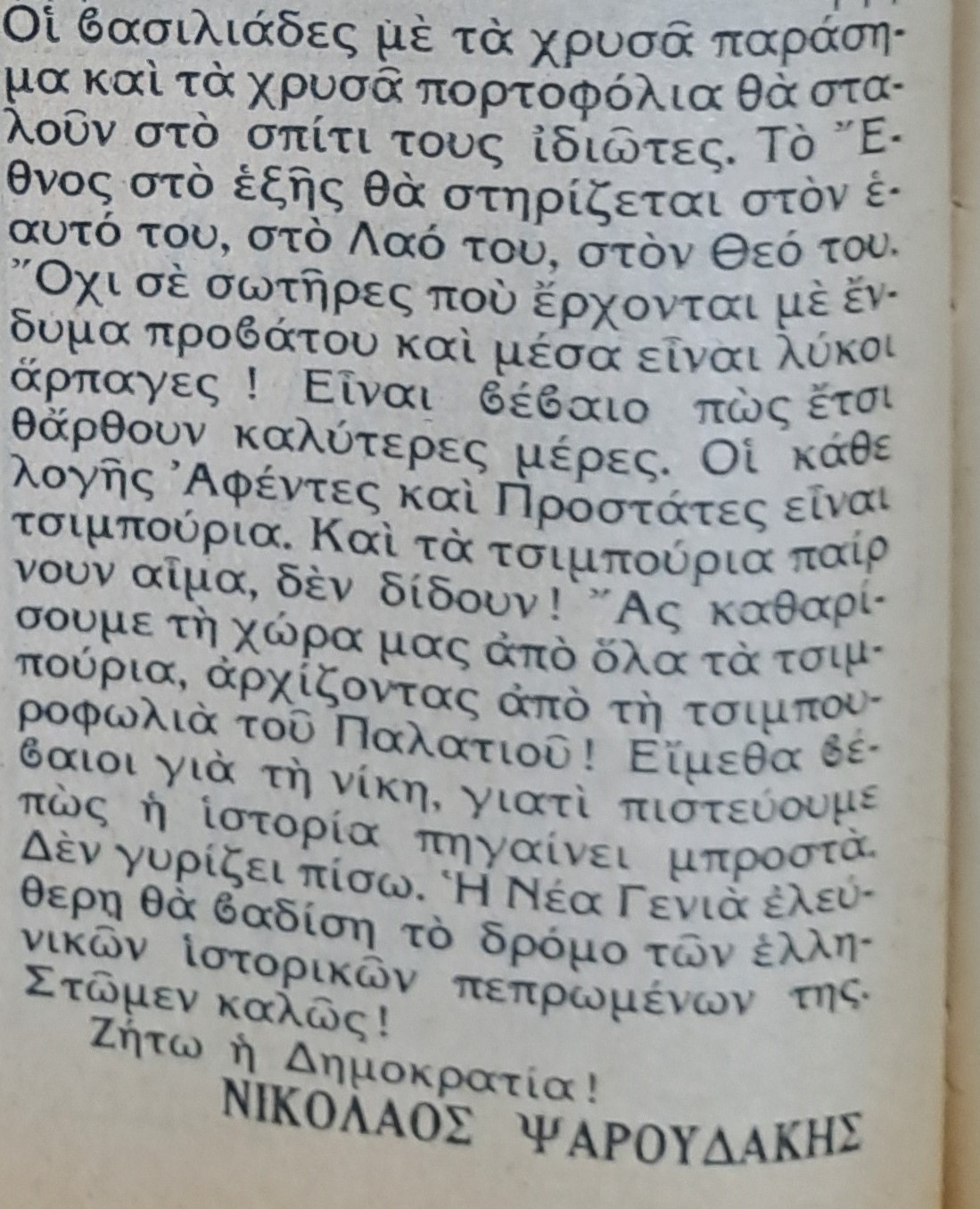 Στη συνέχεια, παραθέτουμε φωτογραφικά το κείμενο του αείμνηστου Νίκου Ψαρουδάκη ενόψει του Δημοψηφίσματος της επομένης στο φύλλο της 7ης Δεκεμβρίου 1974. Επικεντρώνει στην ανάγκη ο λαός να απαλλαγεί από την κληρονομική Βασιλεία, ενός θεσμού που όχι μόνον επισώρευσε δεινά, αλλά και σε κάθε περίπτωση λειτουργούσε παρασιτικά και χωρίς όφελος για το Λαό. Αν ο στόχος επιτεύχθηκε τότε σε επίπεδο πολιτειακό, αντίστοιχου τύπου οικογενειοκρατία συνεχίζεται μέχρι σήμερα σε επίπεδο πολιτικού συστήματος. Άλλωστε, από τότε ο Νίκος Ψαρουδάκης τόνιζε με την ψήφο του στο Δημοψήφισμα, ο Λαός “αρχίζει το ξήλωμα των τυράννων του”, για ένα Έθνος χωρίς “προστάτες”, που “στηρίζεται στον εαυτό του, στο Λαό του, στο Θεό του”. Μια αρχή προφανώς ημιτελής.