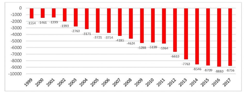 Απολογισμός: Συνολικές απώλειες 73605 ευρώ το 2017 σε σχέση με το 1999 από την πτώση του κατά κεφαλήν εισοδήματος και και 4,325 τρισεκατομμυρίων ευρώ σε επίπεδο ΑΕΠ. Κατά τη έκφραση των ίδιων των μελετητών, “Σε καμμία άλλη χώρα απ’ όσες εξετάστηκαν το ευρώ δεν οδήγησε σε τόσο μεγάλη απώλεια ευημερίας όπως στην Ιταλία…”